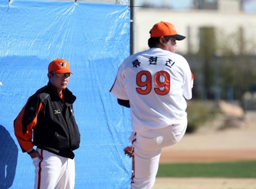 류현진과 박찬호는 7일 일본 오키나와 이시카와 구장에서 열린 LG트윈스와의 연습경기에 등판했다.