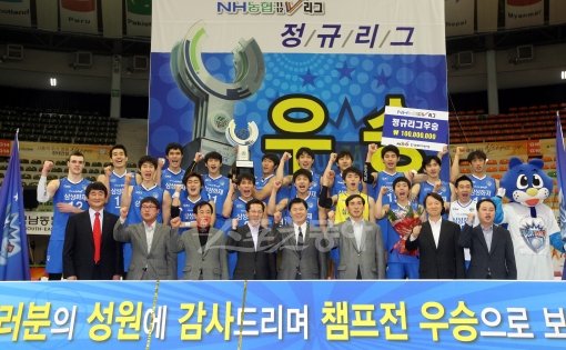 삼성화재가 7일 KEPCO와 경기에서 3-1로 승리를 확정지은 뒤 정규리그 우승을 축하하는 기념촬영을 하고 있다. 첫째줄 맨왼쪽은 신치용 감독. 수원|박화용 기자 inphoto@donga.com 트위터 @seven7sola