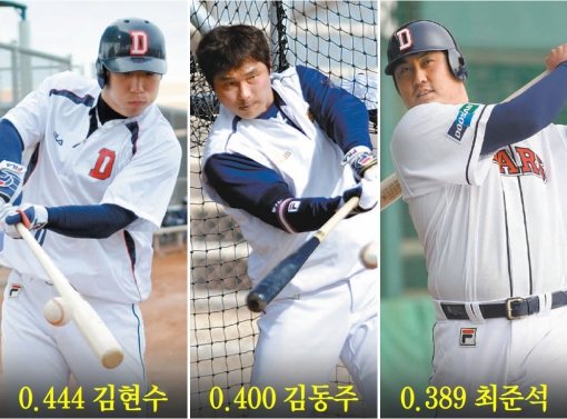 두산은 캠프에서 총 10번의 연습경기를 치렀다. 그 중 9경기(선발 7·대타 1·대수비 1게임)에 출장한 김현수는 타율 0.444(18타수 8안타), 4경기에 출장한 김동주는 0.400(10타수 4안타)의 맹타를 휘둘렀다. 5번타자 최준석도 8경기(선발 7·대타 1경기)에 나서 0.389(18타수 7안타). 중심타선의 타율이 무려 0.413에 달했다. 연습경기에다, 주어진 타석이 많지 않았고, 장타도 나오지 않았지만 세 타자 모두 정확도 면에서 좋은 컨디션을 보였다. 실전감각을 끌어올리는 과정임을 고려하면 출발이 순조로운 편이다.