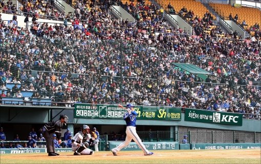 ‘야구야 반갑다!’ 2012 프로야구 시범경기 개막 2연전에 10만 명이 넘는 구름관중이 모였다. 18일 잠실 삼성-LG전에서도 정규시즌을 방불케 하는 수많은 팬들이 몰려들어 삼성 이승엽의 타격 모습을 지켜보고 있다. 잠실|김민성 기자 marineboy@donga.com 트위터 @bluemarine007