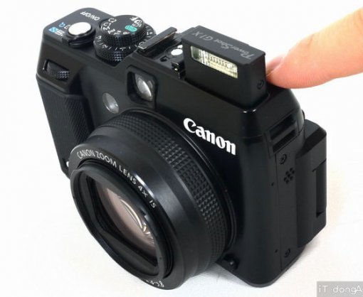 렌즈의 우측 상단에는 내장 플래시가 있다. 팝업식이라 스위치를 젖히면 튀어나온다. 일상적인 촬영에는 이 정도의 소형 플래시로도 충분한 조명을 기대할 수 있지만, 조금 더 전문적인 촬영을 하려면 별도의 외장 플래시가 필요할 것이다. 이를 위해 G1X에는 외장 플래시의 장착이 가능한 핫슈 단자도 있다. 물론, 이런 소형 카메라에 커다란 외장 플래시를 달면 비례가 조금 이상해지긴 하겠지만 아예 못 쓰는 것보단 훨씬 나을 것이다.