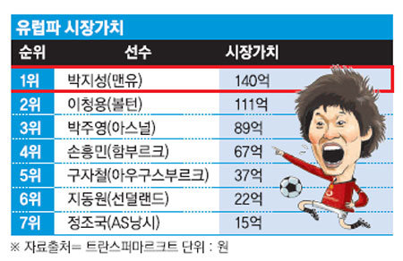 독일의 축구이적시장 전문매체인 트란스퍼마르크트(transfermarkt)가 유럽축구 2011∼2012시즌 겨울이적시장이 끝난 뒤 최근 갱신한 자료에 의하면 박지성(맨유)의 몸값이 가장 높은 것으로 드러났다.