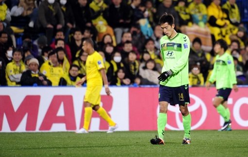 전북 김정우(가운데)가 21일 가시와 레이솔과의 AFC 챔피언스리그 H조 2차전 원정에서 패한 뒤 침통한 표정으로 그라운드를 빠져나오고 있다. 가시와(일본)|사진공동취재단