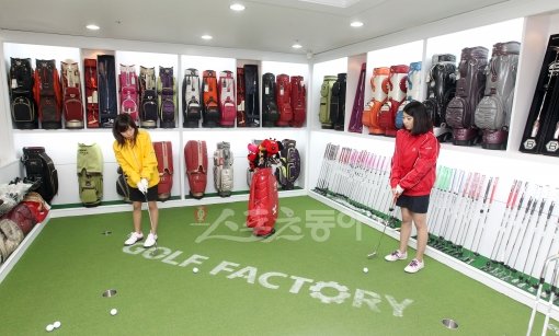 골프존이 골프팩토리 4호 역삼점을 오픈했다. 여성 고객들이 여성전용매장에서 퍼트하며 제품을 시타하고 있다(사진 위). 지하 1층에 마련된 시타 부스에서 고객이 직원으로부터 클럽에 대한 설명을 듣고 있다. 김종원 기자 won@donga.com 트위터 @beanjjun