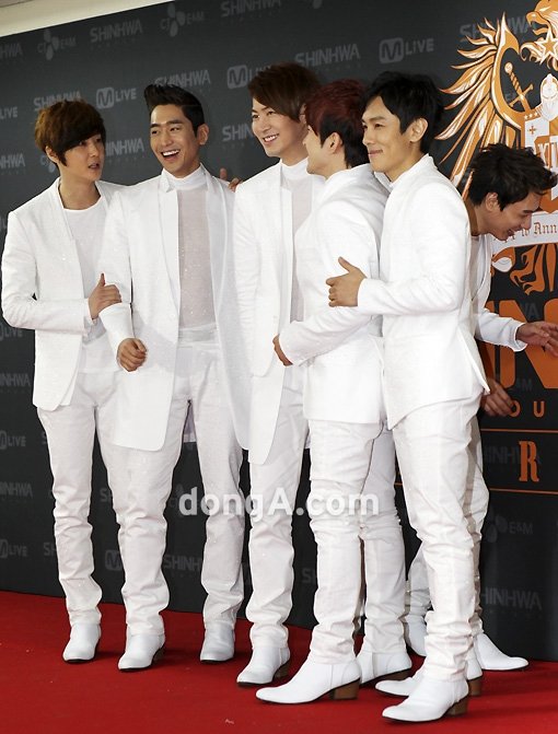 그룹 신화가 25일 오후 서울 송파구 올림픽체조경기장에서 열린 2012 SHINWA GRAND TOUR IN SEOUL ‘THE RETURN’기자회견에서 포즈를 취하고 있다. 신혜성, 에릭, 전진, 이민우, 김동완, 앤디.(왼쪽부터)