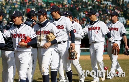 5일 오후 서울 송파구 잠실동 잠실야구장에서 `2012 프로야구 시범경기` 두산 베어스와 KIA 타이거즈의 경기에서 두산이 3-0으로 이긴 뒤 승리를 자축하고 있다.