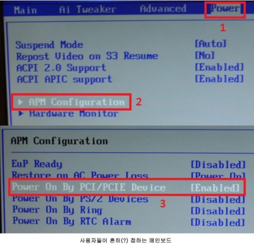조금 예전에 나온 메인보드를 쓰고 있다면, WOL 관련 옵션은 일반적으로 Power 메뉴에 있는 경우가 많다. 이 경우 APM 옵션에 진입해 'Wake Up LAN', 또는 'POWER ON By PCI'를 Enabled로 설정하면 된다. 보다 자세한 정보는 메인보드 제조사에 문의하도록 하자.