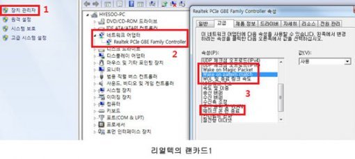 그 다음은 랜카드를 설정할 차례다. 먼저 랜카드를 최신 드라이버로 업데이트 하자. 구 버전 드라이버에서는 WOL 메뉴를 쓸 수 없는 경우가 많기 때문이다. 그 다음 내 컴퓨터를 마우스로 우클릭해서 속성 > 장치관리자 > 네트워크 어댑터 > 랜카드를 선택하면 ‘랜카드 속성’이 뜬다.
