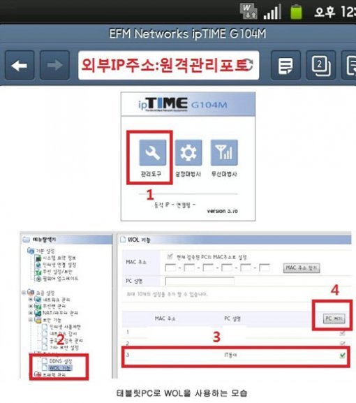 설정이 끝났다면 이제 직접 사용해볼 차례다. 스마트폰 및 태블릿PC의 인터넷 브라우저를 열고 주소창에 방금 적어둔 외부IP주소를 입력하고 콜론을 입력한 후 원격 관리 포트 번호 4자리 숫자를 입력하면 된다(예시 ‘210.117.103.121:0123’, 중간에 콜론을 입력해야 하는 것을 주의). 이렇게 입력을 마치면 외부에서 공유기 설정에 접속할 수 있다. 이제 관리 도구 > 고급 설정 > WOL 기능으로 이동해 사용자의 PC를 선택하고 ‘PC 켜기’를 누르자. 이제 언제 어디서든지 PC를 원격으로 부팅할 수 있다.