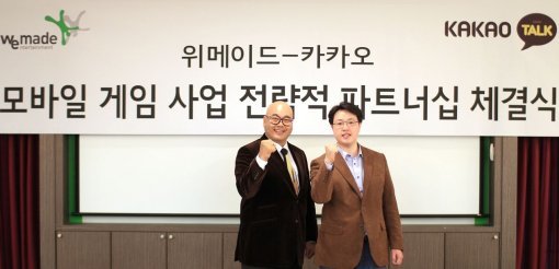 카카오는 28일 모바일 게임 사업 진출을 위해 위메이드 엔터테인먼트와 전략적 파트너십을 체결했다(사진). 카카오는 4월 말에 카카오톡 서비스 내에 게임을 연결해주는 ‘게임센터’를 오픈하고 베타서비스를 시작할 계획이다.