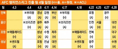 亞챔스리그 참가 K리그 4룡 ‘지옥의 4월 생존전략’
