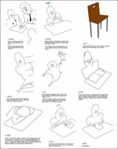이 게시물은 학생들이 쉬는 시간에 보이는 행태를 총 9가지 유형으로 정리한 것.