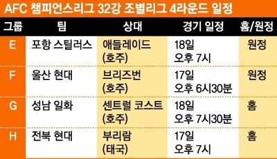 한편 E조 1위 포항(2승1패), F조 2위 울산(1승2무), G조 2위 성남(3무)은 모두 호주 팀과 경기를 갖는다. 포항과 울산은 18일 애들레이드 유나이티드, 17일 브리즈번 로어와 원정경기를 치른다. 성남은 18일 센트럴 코스트를 안방으로 불러들인다.