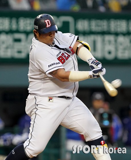 17일 저녁 잠실야구장장에서 열린 `2012 팔도 프로야구` 두산 베어스와 삼성 라이온즈의 경기에서 두산 5번타자 최준석이 1회말 1사 1,2루 때 삼성 장원삼의 투구를 통타 스리런홈런을 치고 있다.