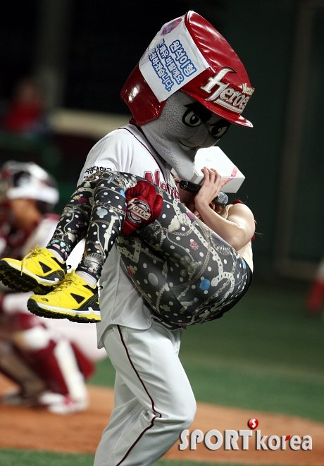 넥센의 턱돌이가 공연이 끝난 달샤벳 수빈을 들고 퇴장하고 있다.
