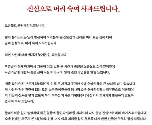 오픈월드엔터테인먼트가 공식사과문을 발표했다.