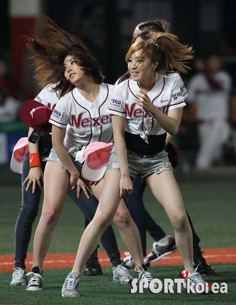 ‘2012 팔도 프로야구’ 넥센 히어로즈와 KIA 타이거즈의 경기가 18일 오후 목동야구장에서 열렸다. 클리닝 타임을 이용해 걸그룹 브레이브걸스가 멋진 공연을 펼치고 있다.