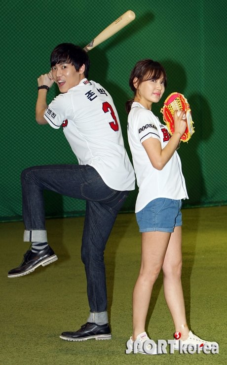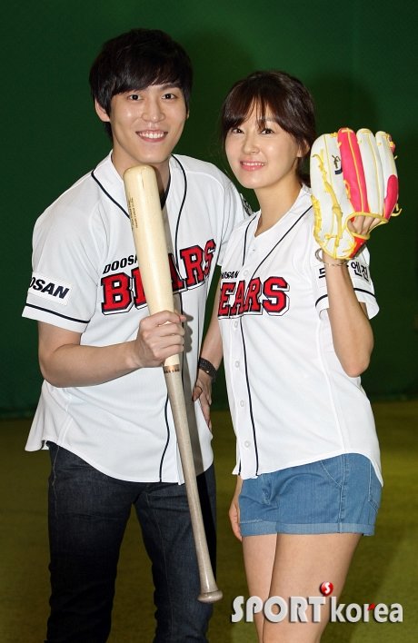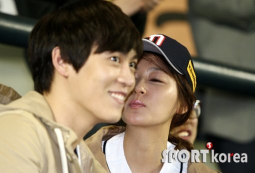 이 날 시구, 시타자였던 배우 박진희와 가수 존 박이 키스타임때 지목 되자 볼에 뽀뽀하고 있다.