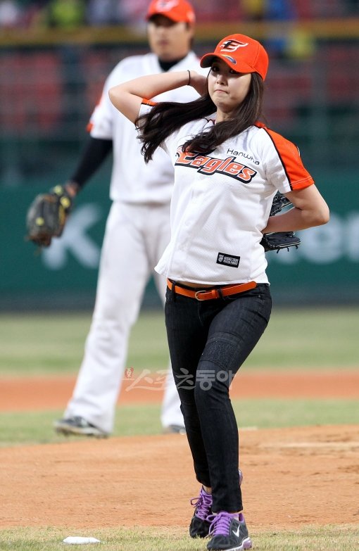 19일 저녁 청주야구장에서 열린 2012프로야구 한화와 LG의 경기에서 탤런트 조향기가 시구자로 나와 시구를 하고 있다.