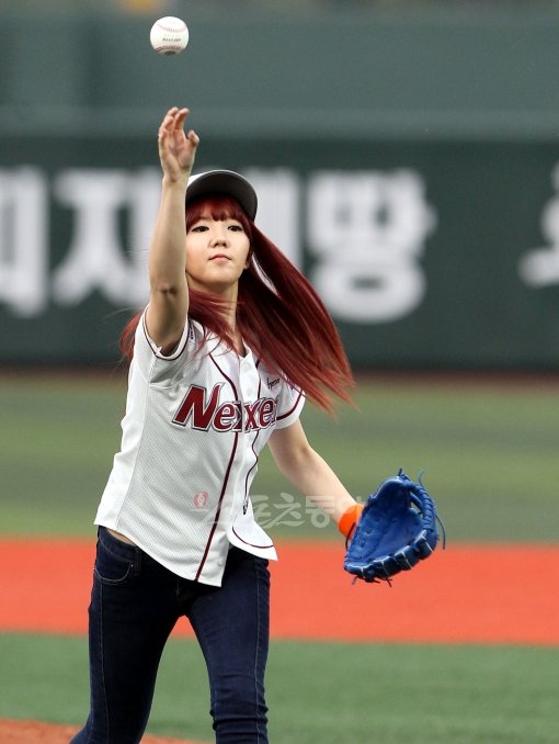 20일 저녁 서울 목동야구장에서 열린 2012프로야구 넥센과 두산의 경기에서 여성그룹 씨리얼의 앤제이가 시구를 하고 있다.