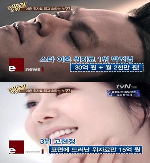 지난 20일 방송된 tvN ‘enews(이뉴스)’에서는 ‘기막힌 순위’ 코너를 통해 이혼 위자료를 가장 많이 준 연예인들을 알아보고 순위를 매겼다.