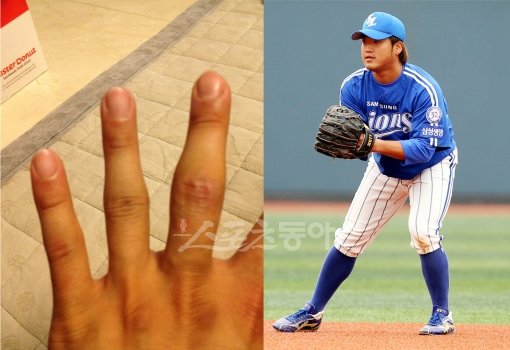 삼성 박석민(오른쪽)이 자신의 트위터(@Psm0070)를 통해 “손가락은 현재 통증이 전혀 없습니다. 걱정해주신 많은 분들 감사합니다”라며 자신의 왼손 중지 사진을 공개했다. 사진제공|박석민 트위터, 스포츠동아DB