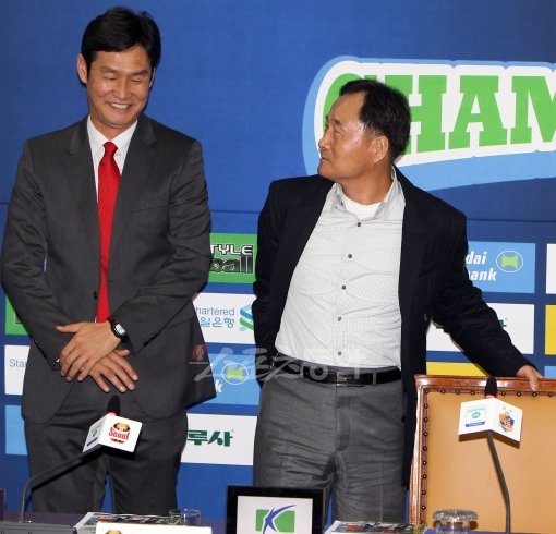 울산 김호곤(오른쪽), 서울 최용수 감독은 25일 맞대결을 앞두고 전화통화를 했다. 훈훈한 대화 속에 날카로운 칼이 숨어 있었다. 작년 6강 플레이오프 기자회견장에서 만나 환하게 웃고 있는 두 감독. 스포츠동아DB