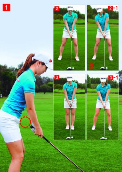 1. 그립을 쥔 손은 몸과 너무 멀리 떨어져 있어도, 너무 가깝게 붙어 있어도 좋지 않다. 주먹이 여유롭게 지나갈 정도의 공간이 가장 좋다. 2, 2-1. 공은 스탠스 중앙보다 약간 왼발 쪽에 위치해 있어야 한다. 이 때 머리는 공보다 약간 뒤쪽에 있는 게 가장 좋은 어드레스다. 머리가 공보다 앞에 있거나 지나치게 뒤쪽에 있는 건 좋지 않다. 3, 3-1. 공의 위치를 정하는 쉬운 방법은 양 발을 모은 상태에서 클럽 헤드를 땅에 내려놓고 그 다음 발을 벌려 공이 왼발 뒤꿈치와 일직선을 이루는 지점에 위치하도록 한다. 스포츠동아DB