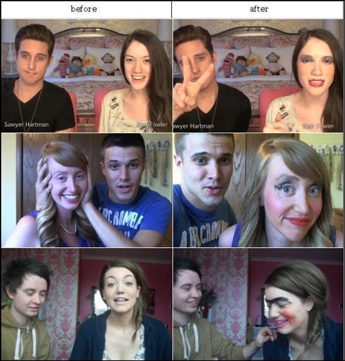 영상 속 남자친구들은 여자 친구의 눈을 섀도우로 멍이 든 것처럼 표현하거나 피부색을 태닝한 사람처럼 만들어 놓았다.