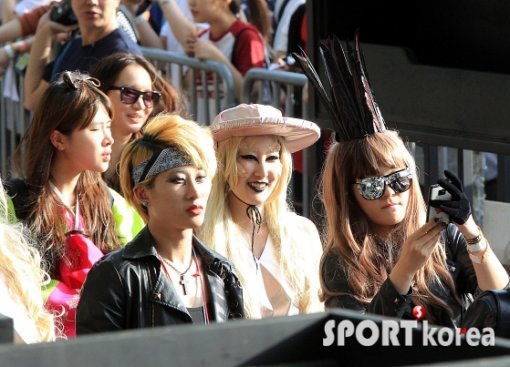 팝스타 레이디 가가(26·미국)의 월드투어 첫 공연이 열리는 27일 서울 잠실종합운동장 올림픽주경기장에서 팬들이 독특한 복장을 하고 입장하고 있다.
