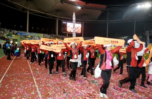 생활체육 동호인들의 최대 행사인 전국생활체육대축전이 11일부터 13일까지 대전광역시에서 열린다. 올해 12회를 맞은 대축전에는 56개 종목에 걸쳐 1만4000여 명의 생활체육 동호인 선수들이 출전한다. 사진은 2011년 인천광역시에서 열린 대축전의 개막식 선수단 퍼레이드. 사진제공|국민생활체육회