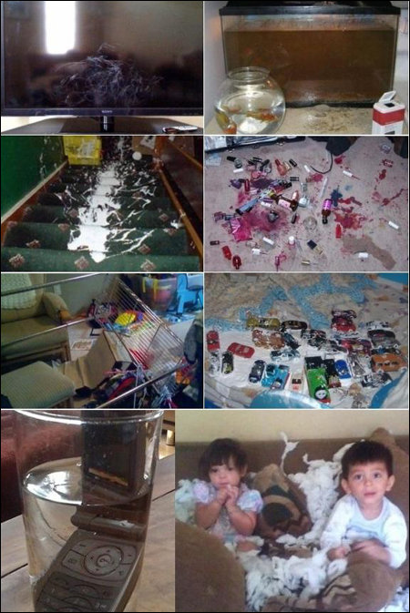 사진 속 꼬마들은 갖가지 방법으로 집안을 난장판으로 만들어 놓았다. 스마트 TV는 물론이고 휴대폰, 모니터 등 값비싼 물건들도 망가뜨린 상황.