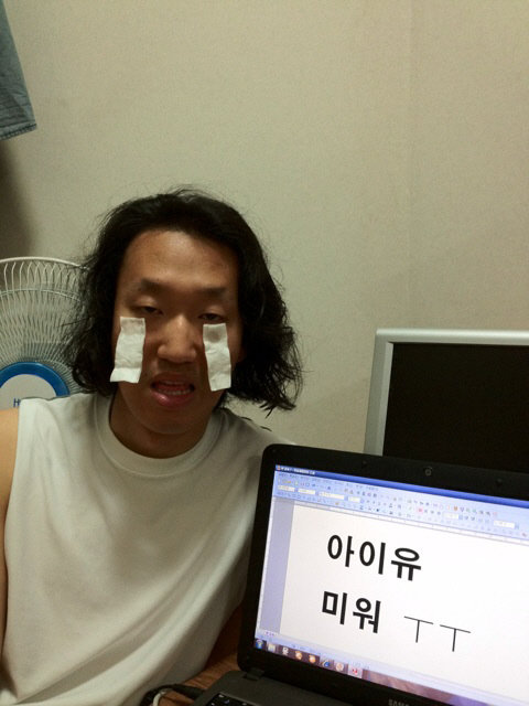 사진 속 김경진은 노트북 화면에 ‘아이유 미워’라는 글을 적은 후에 눈 밑에 휴지를 붙인 뒤 우는 표정을 짓고 있어 웃음을 자아냈다.