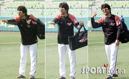 ‘2012 팔도 프로야구’ 삼성 라이온즈와 한화 이글스의 경기가 4일 오후 대구 시민야구장에서 열린다. 경기전 한화 박찬호가 삼성 이승엽에게 지난 1일 벌어졌던 우천 세레머니에 대해 얘기를 하고 있다.