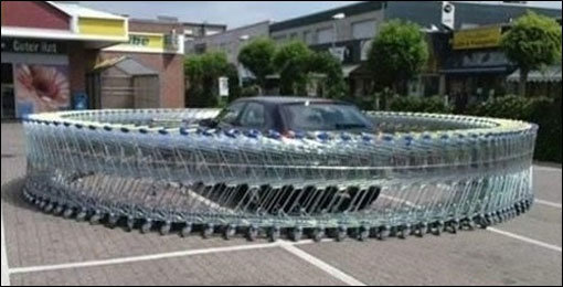 공개된 사진은 100원짜리 동전으로 잠금장치를 풀 수 있는 쇼핑카트가 차량 한대를 중심으로 원형으로 둘러싼 모습이다. 차주인은 온데간데없이, 차만 카트 안에 갇힌 것이다.