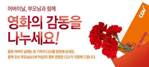 CGV가 어버이날인 8일 하루 동안 ‘CGV 부모님 무료 관람’ 행사를 연다.
