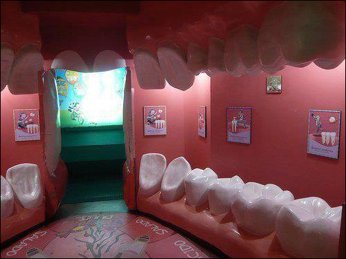 공개된 사진을 보면 사람의 입 안과 똑같은 인테리어를 갖춘 치과 대기실로 선홍빛의 벽면과 치아모형의 의자가 대단히 인상적이다.