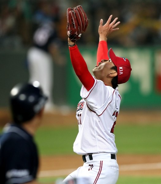 두산전 5회 2사서 손시헌의 내야 플라이를 직접 잡고 있다. 사진제공|스포츠코리아