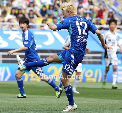 연예인축구단 FC MEN이 13일 오후 수원월드컵경기장에서 열린 프로축구 수원 삼성과 광주 FC전에 앞서 수원 매탄중 친선 오픈경기를 가졌다. 후반전 FC MEN 김준수가 선제골을 성공시키고 있다.