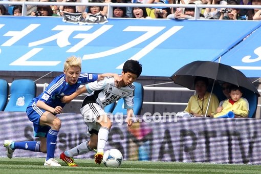 연예인축구단 FC MEN이 13일 오후 수원월드컵경기장에서 열린 프로축구 수원 삼성과 광주 FC전에 앞서 수원 매탄중 친선 오픈경기를 가졌다. 후반전 FC MEN 김준수가 상대 수비수와 볼을 다투고 있다.