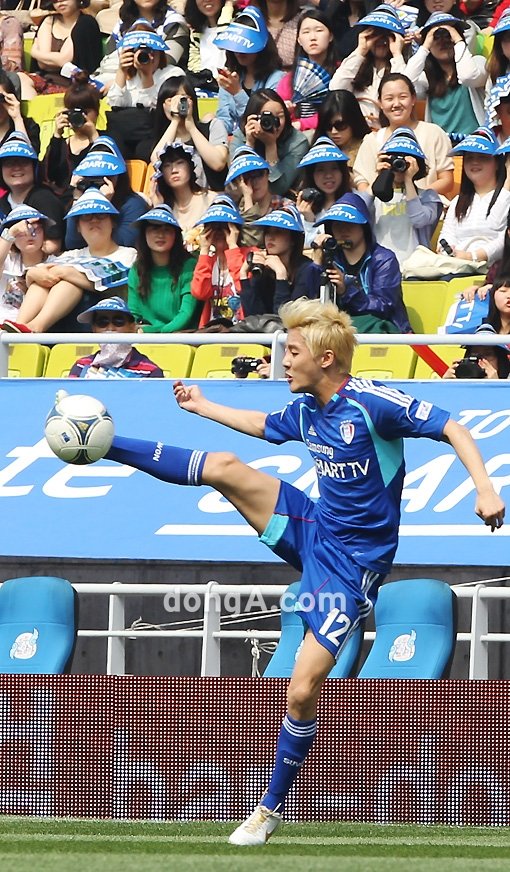 연예인축구단 FC MEN이 13일 오후 수원월드컵경기장에서 열린 프로축구 수원 삼성과 광주 FC전에 앞서 수원 매탄중 친선 오픈경기를 가졌다. 후반전 FC MEN 김준수가 공을 잡고 있다.
