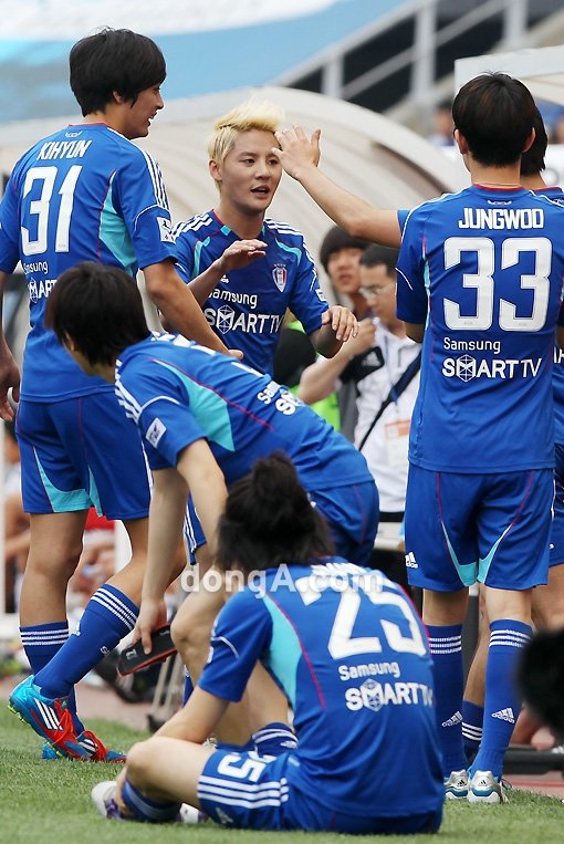 연예인축구단 FC MEN이 13일 오후 수원월드컵경기장에서 열린 프로축구 수원 삼성과 광주 FC전에 앞서 수원 매탄중 친선 오픈경기를 가졌다. FC MEN 김준수가 첫골을 성공시킨 뒤 교체되고 있다.