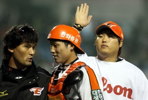 “야호, 2승이다!” 13일 대전 롯데 전에서 8이닝 1실점의 호투로 승리투수가 된 류현진이 경기 종료 후 박찬호와 대화 중인 포수 정범모의 헬멧을 두드리고 있다. 최근 호투를 펼치고도 타선의 지원을 받지 못했던 류현진은 타선의 든든한 후원을 등에 업고 모처럼 승리투수가 됐다. 대전|김민성 기자 marineboy@donga.com 트위터 @bluemarine007