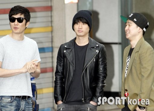 14일 오전 서울 용산 국방홍보원에서 연예병사로 복무 중이던 `에픽하이`의 미쓰라진(본명 최진)의 전역을 축하하기 위해 DJ투컷츠, 타블로, 얀키(왼쪽부터)가 위병소 앞에서 기다리고 있다.