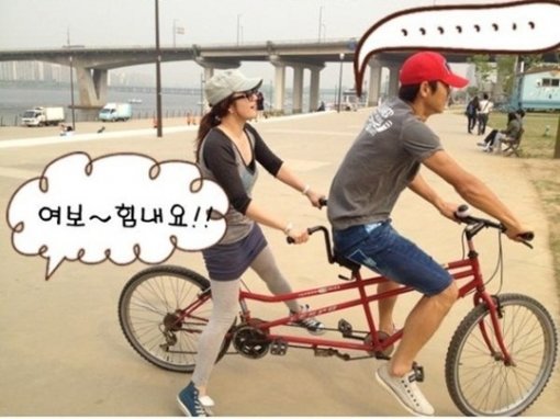 사진 속 김보민, 김남일 부부는 한강변에서 나란히 2인용 자전거를 타고 있는 모습이다. 사진 속에 말풍선을 그리고 “여보 힘내요!”라는 글을 적어 웃음을 자아낸다.