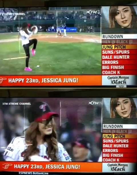 스포츠채널 ESPN이 제시카의 ‘패대기 시구’ 영상을 보도한 모습. 사진출처|ESPN 화면 캡처