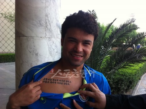 성남 브라질 용병 에벨찡요가 가슴에 새긴 문신을 보여주고 있다. 톈진(중국)|윤태석 기자