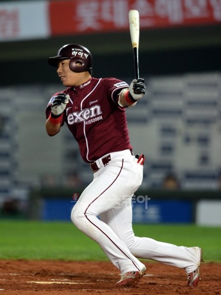 16일 부산 사직야구장에서 열린 3위 롯데자이언츠 대 5위 넥센히어로즈 경기 9회초 무사 넥센 강정호가 좌전 안타를 치고 있다. 사직 | 김종원기자 won@donga.com 트위터 @beanjju