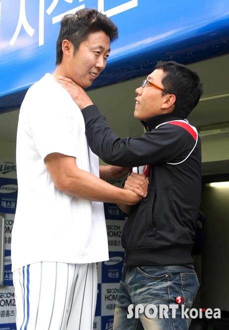 방송인 김제동이 17일 오후 삼성 라이온즈와 KIA 타이거즈가 경기를 갖는 대구 시민구장에 나타나 배영수와 인사를 나누고 있다.
