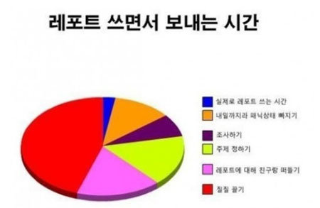 가장 많은 시간을 차지하는 행동은 ‘질질끌기’. 그리고 ‘레포트에 대해 친구랑 떠들기’, ‘주제 정하기’, ‘내일까지라 패닉 상태 빠지기’, ‘조사하기’ 순으로 그래프를 차지하고 있다. 정작 레포트를 쓰는 시간은 총 6가지 행동 중 가장 적게 차지하고 있어 웃음을 자아낸다.